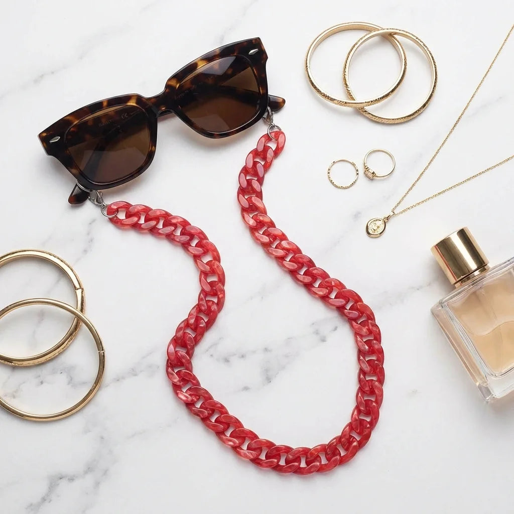 Cadena de acetato reciclado para lentes rojo flat lay accesorios moda mármol Bonoboss #color_rojo