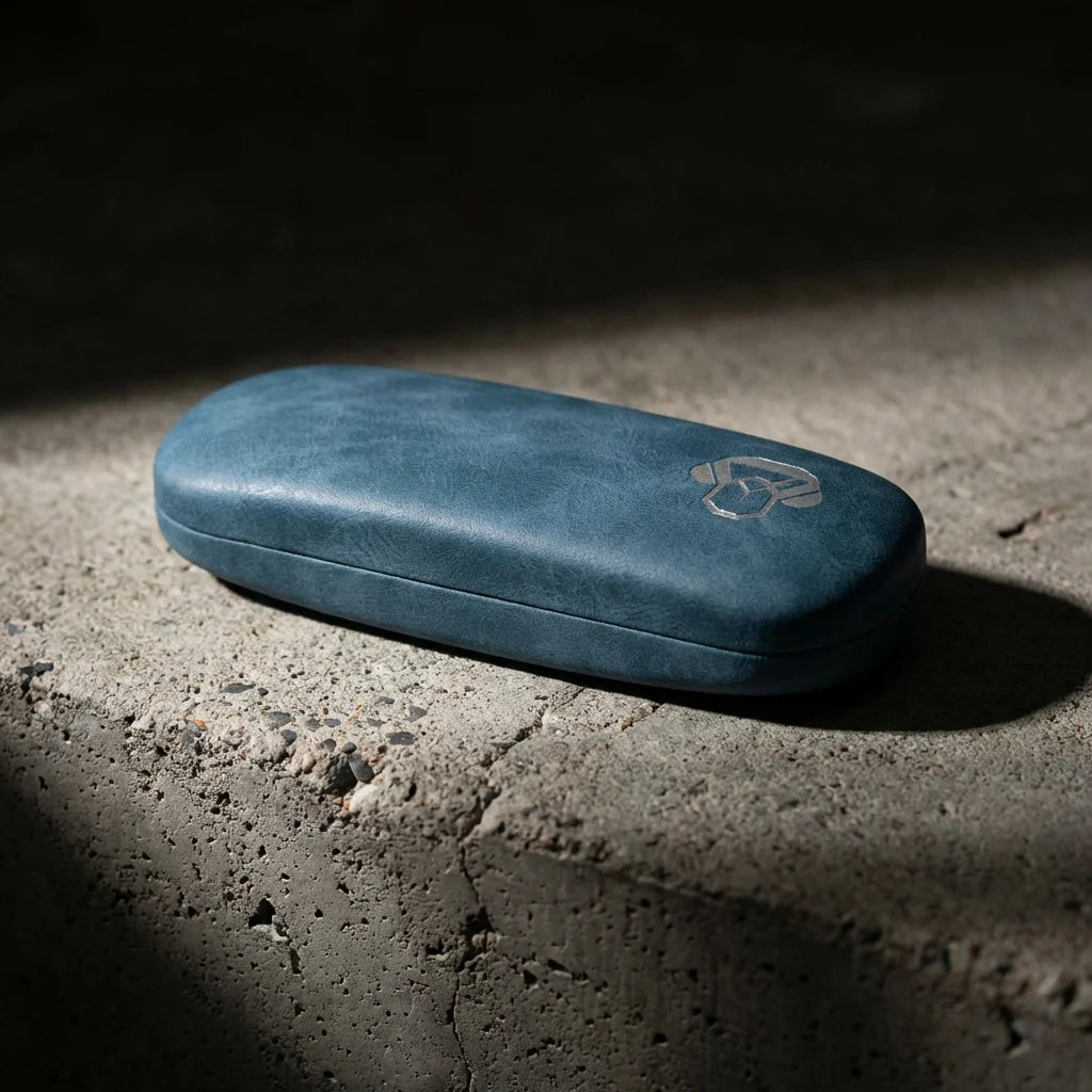 Estuche almeja para lentes azul luz lateral dramática editorial Bonoboss #color_azul