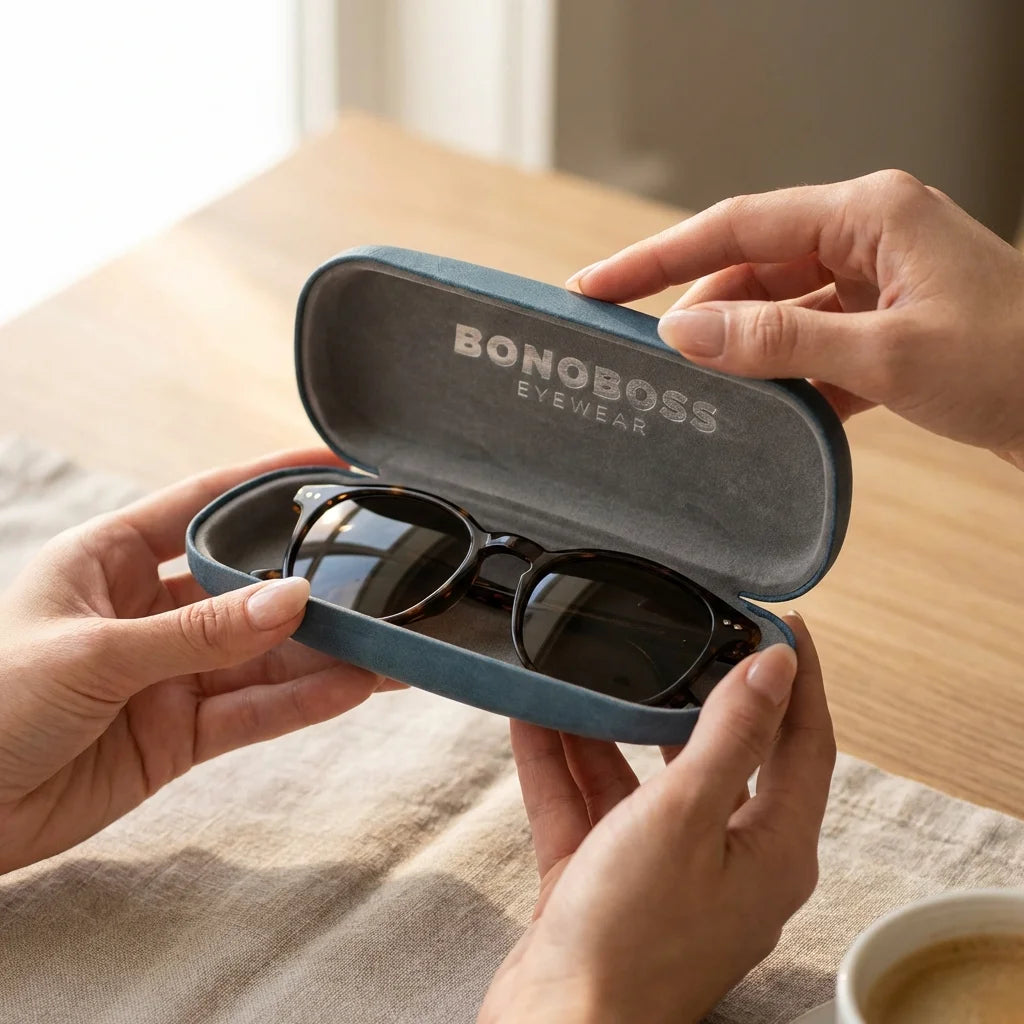 Estuche almeja para lentes en mesa de restaurante Bonoboss