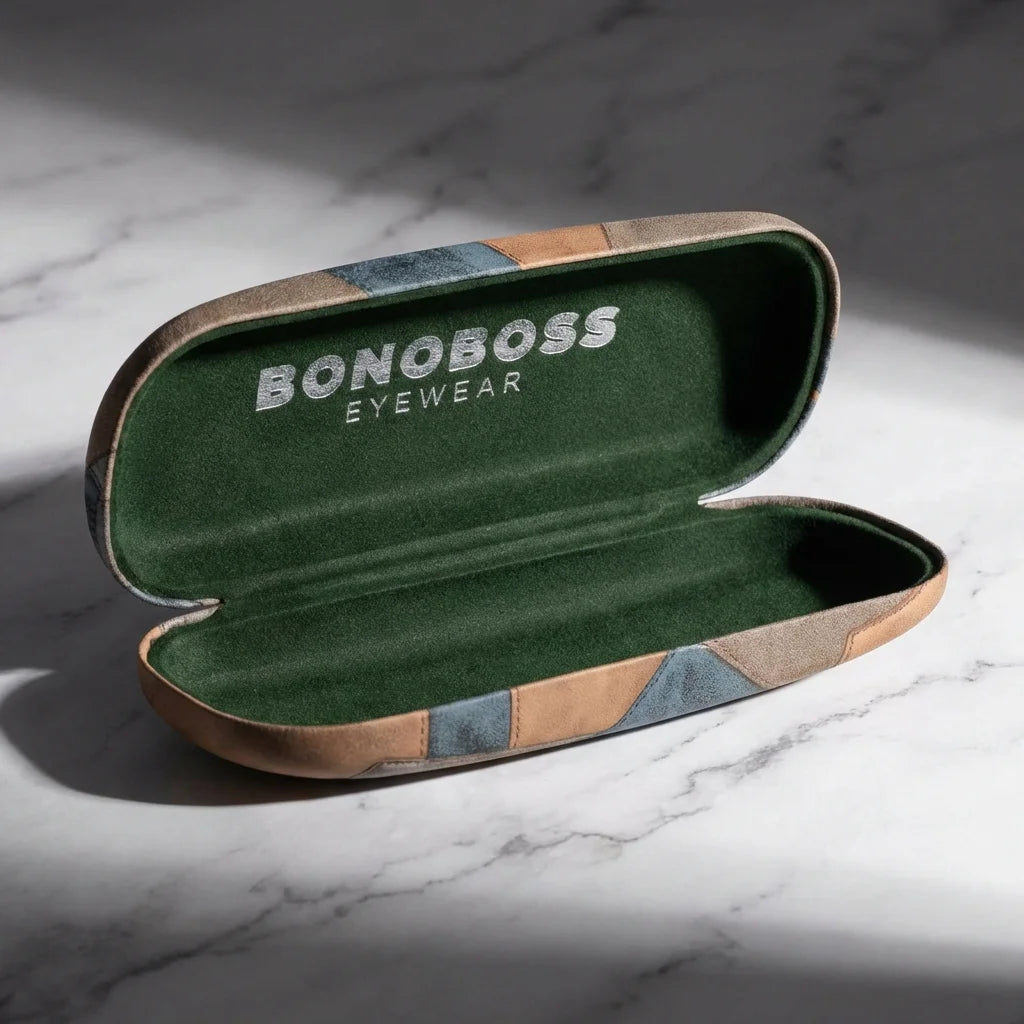 Estuche almeja para lentes luz lateral dramática editorial Bonoboss