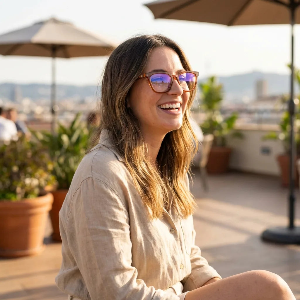 Lentes ópticos Oliver Brown mujer en terraza con vista panorámica Bonoboss #editorial_lifestyle2 #color_brown