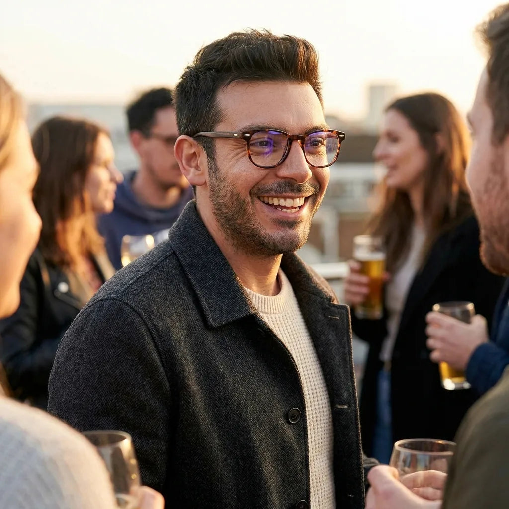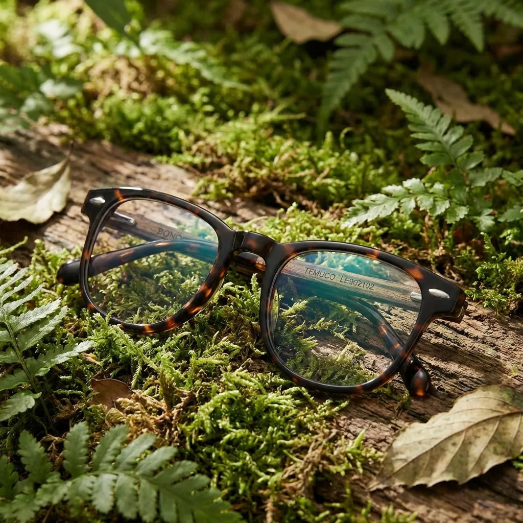 Nuestros marcos ópticos están fabricados en bio-acetato de celulosa, un material derivado de fibras naturales de algodón y madera. No es plástico de petróleo. Es un material premium, reparable y ajustable que envejece con gracia.