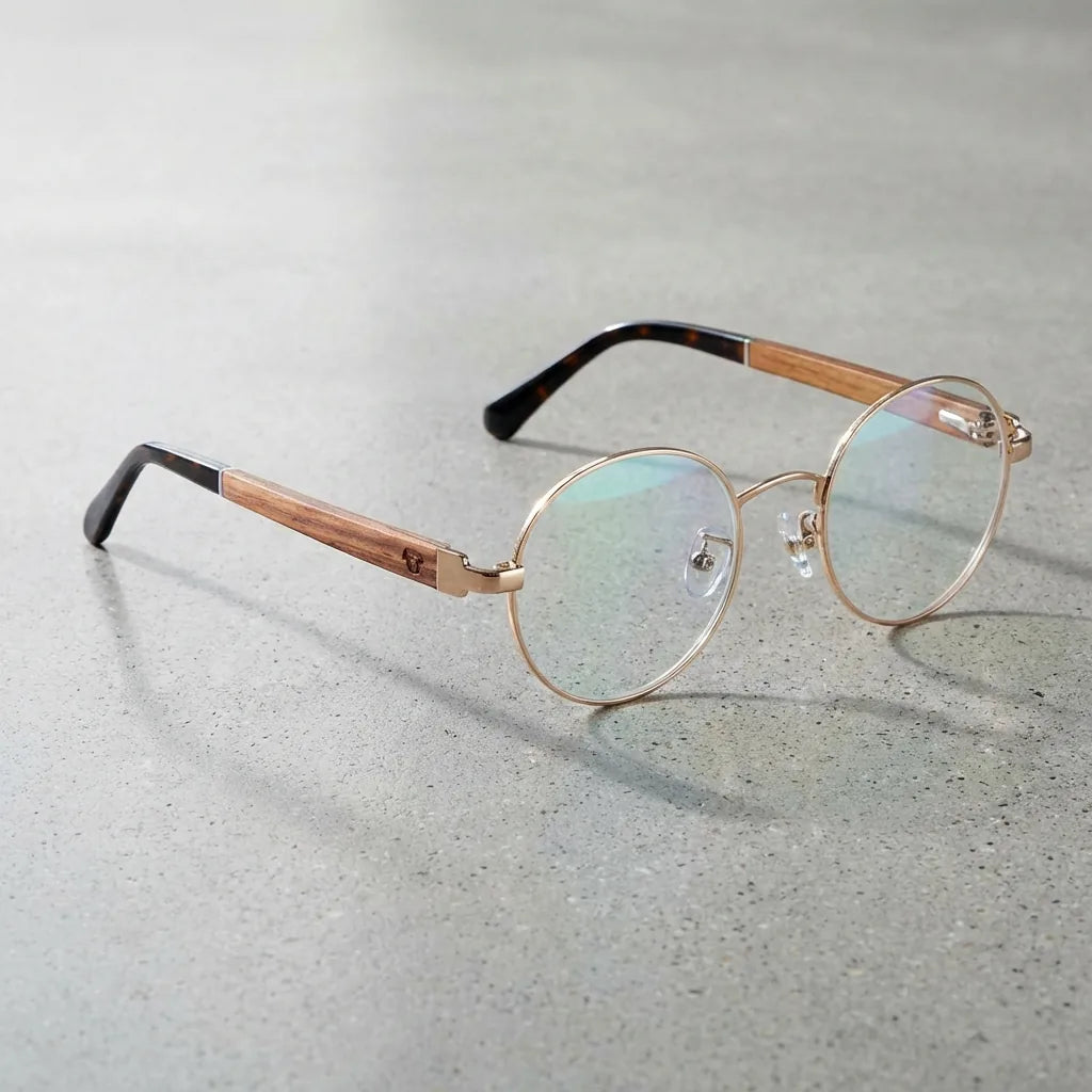 marcos lentes opticos redondos color dorado pata de madera armazon de metal  filtro azul hombre mujer