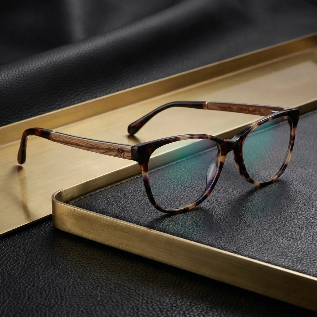 Bio-Acetato vegetal combinado con madera natural real. Cada par tiene una veta única — literalmente no existe otro igual al tuyo.
