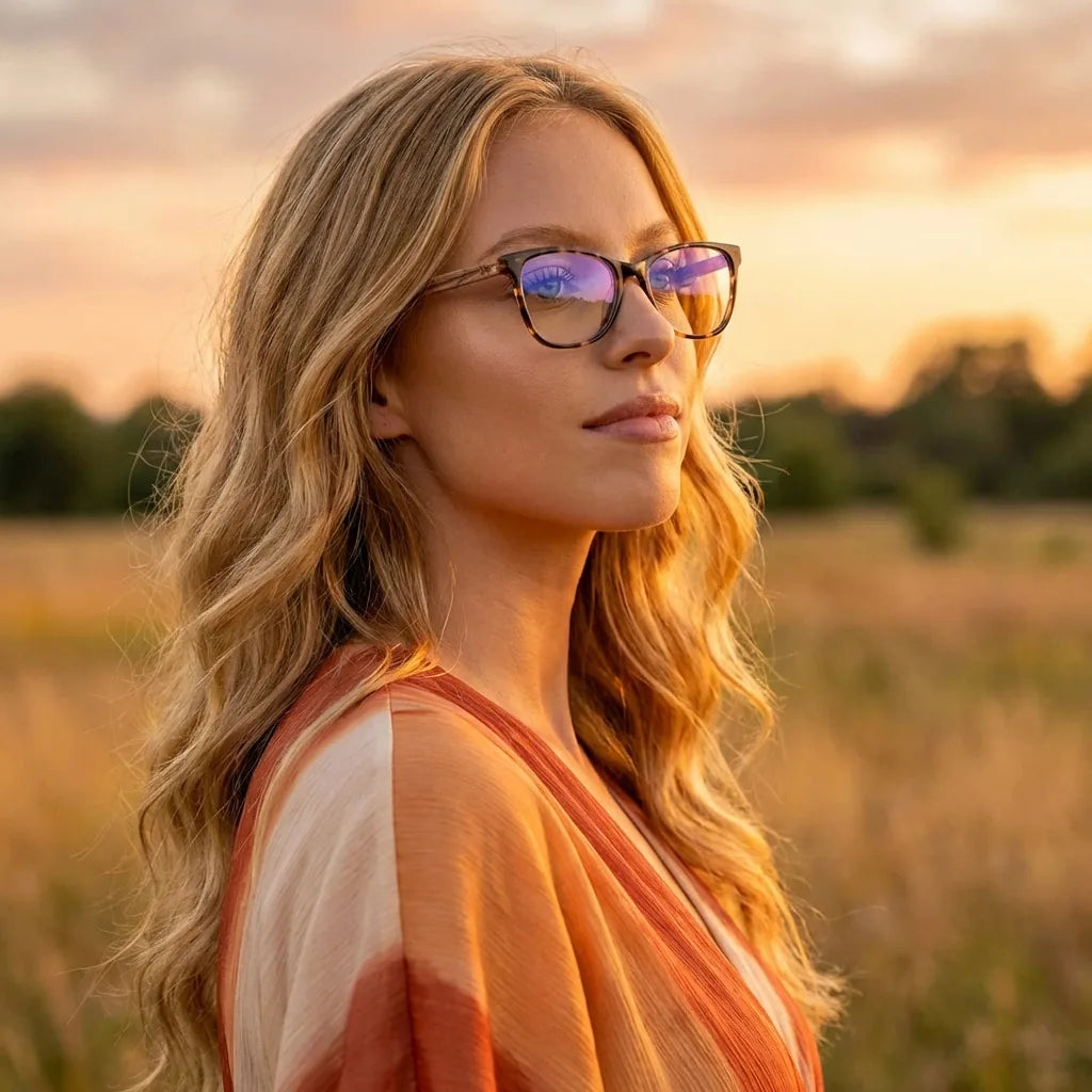Lentes ópticos Hanga Roa Calipso mujer en luz dorada golden hour elegante Bonoboss #editorial_lifestyle2 #color_calipso