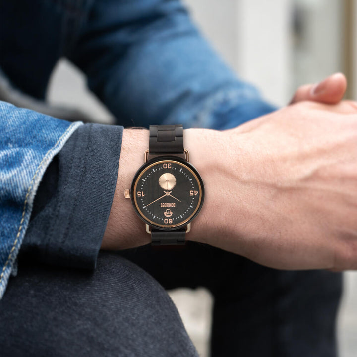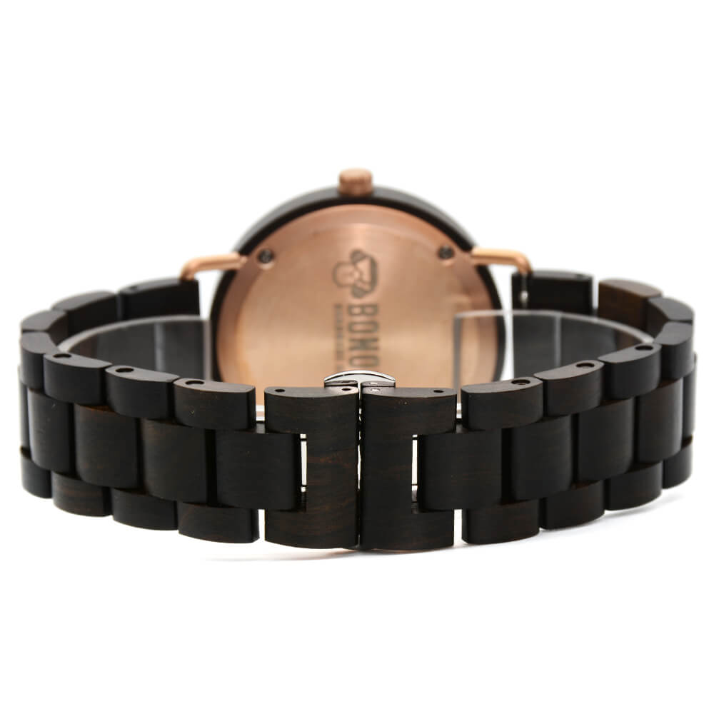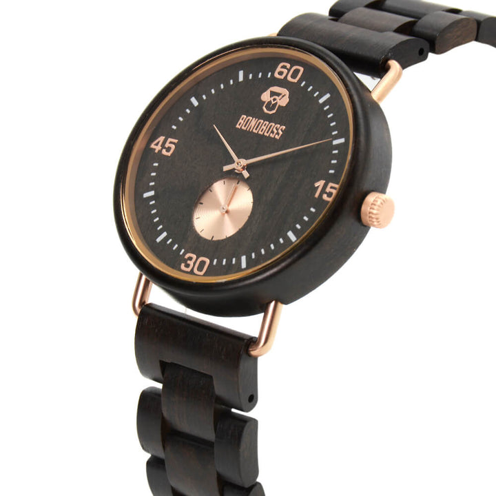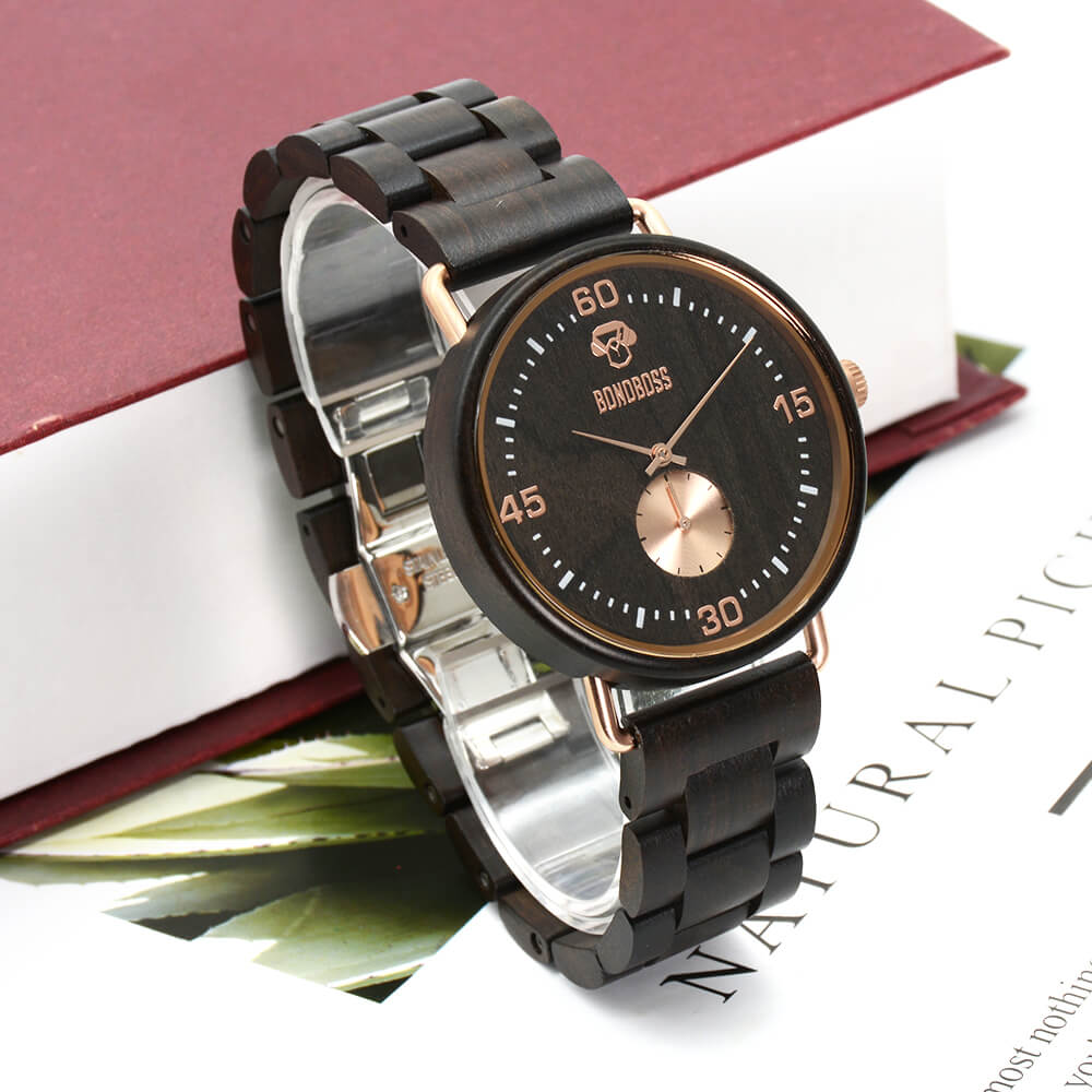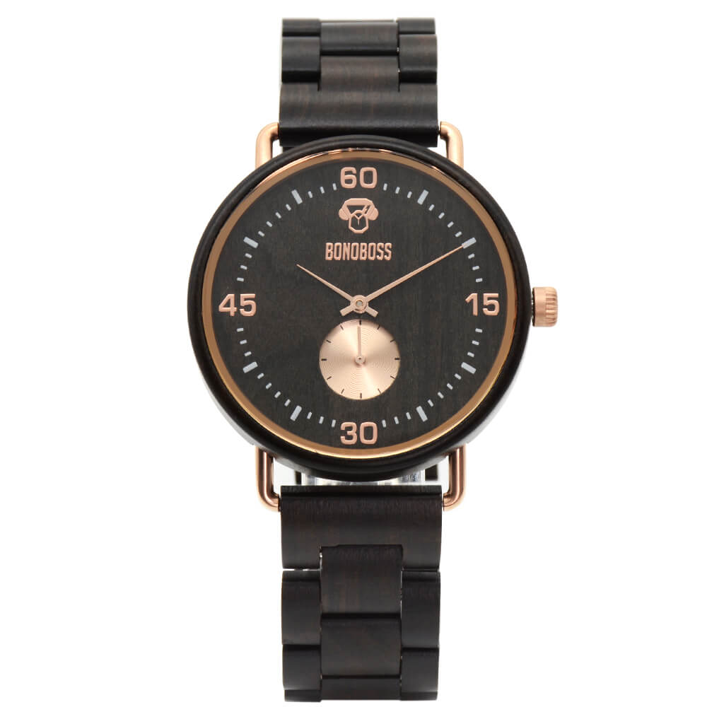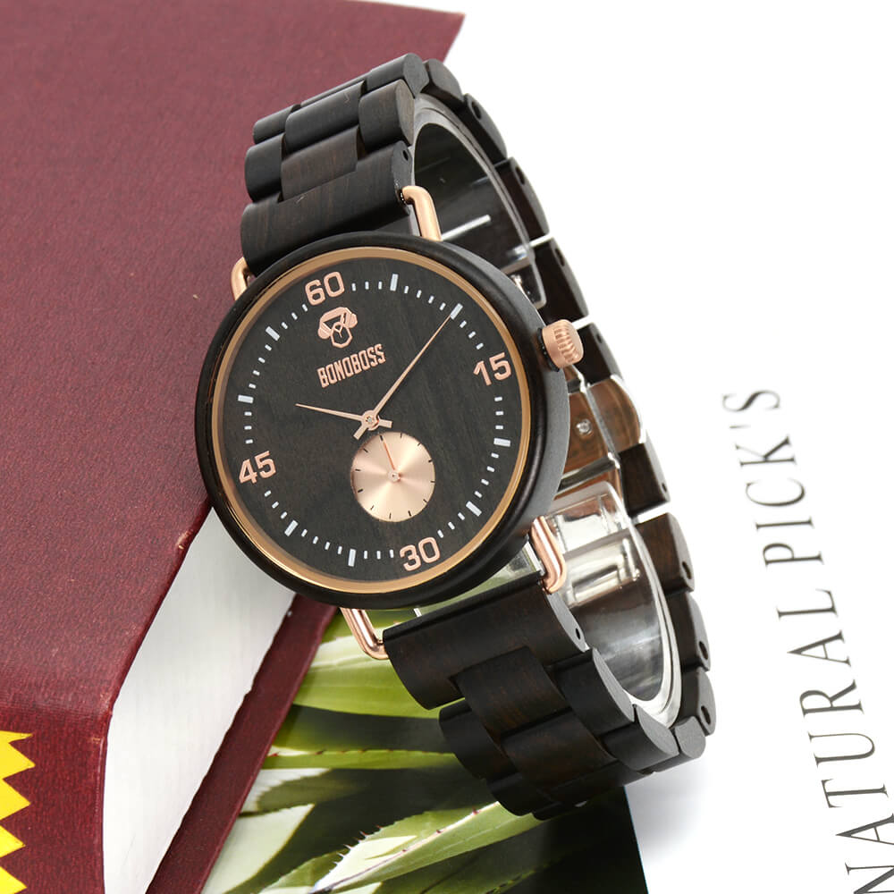 El reloj que estás mirando es de madera natural de sándalo negro y al comprarlo en Bonoboss.cl tendrás 2 años de garantía en su maquinaria.